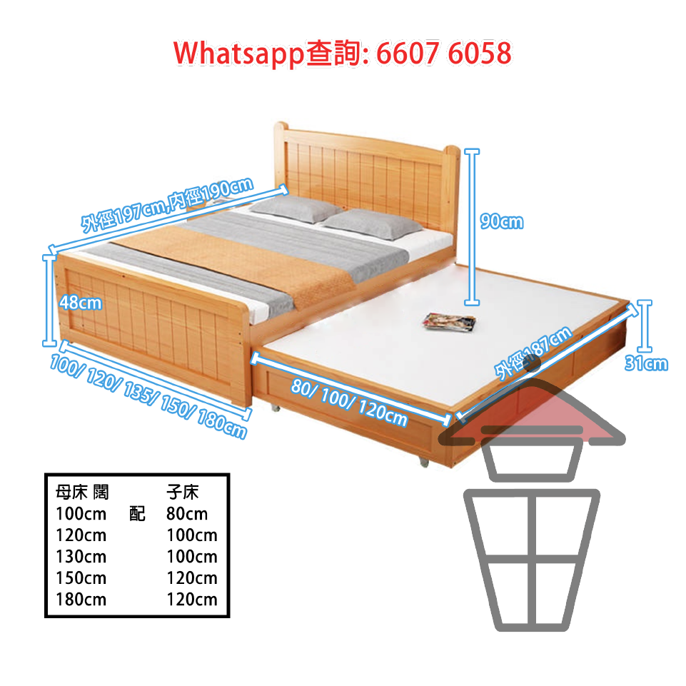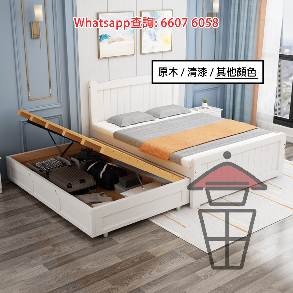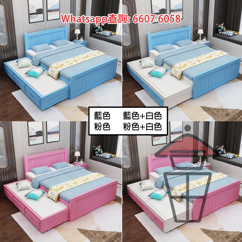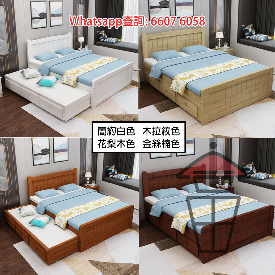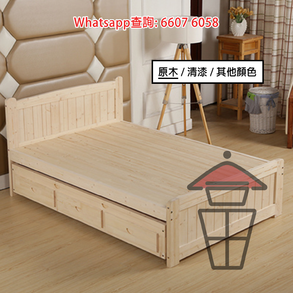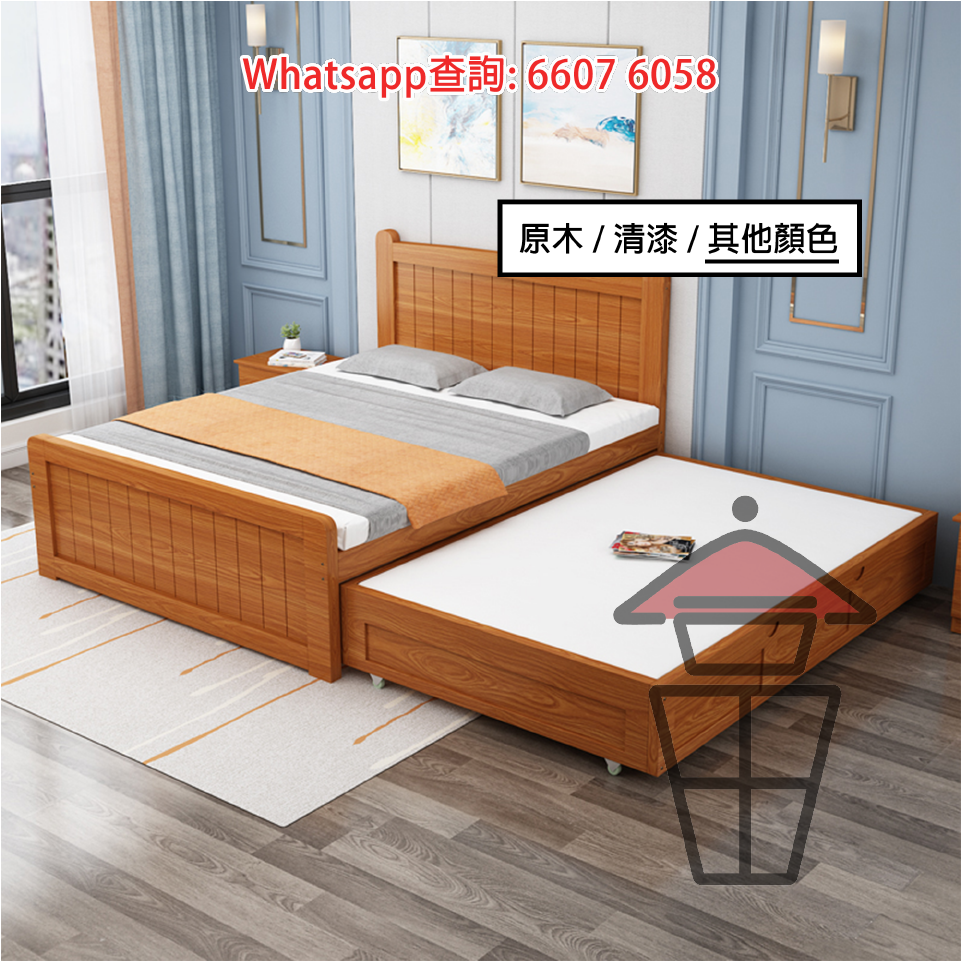 BD55 樟子松木子母床架(實木) 床下拖床 Pine Wood Bed Frame with Sliding Bed thereunder [尺寸可訂]
